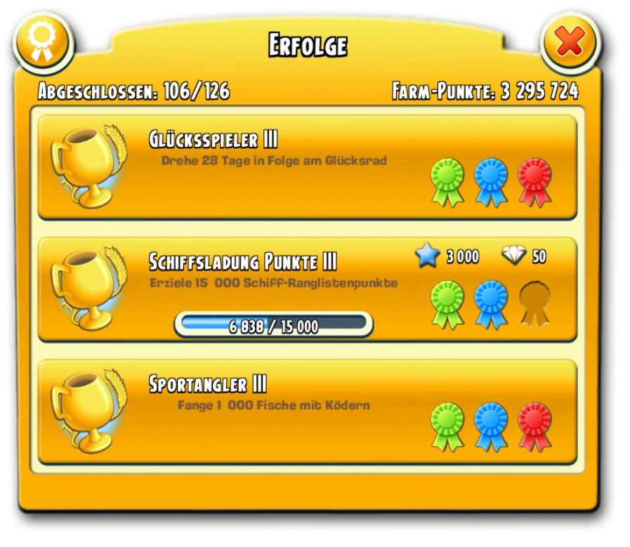 Diamanten. Jeder Erfolg hat drei Stufen wobei die jeweils nächste Stufe schwieriger zu meistern ist als die vorherige, dafür werden die Belohnungen aber auch interessanter. Um den Fortschritt in Erfolgen zu verfolgen oder eure Belohnungen abzuholen, tippt einfach euer Farmhaus an. Es gibt zurzeit folgende Erfolge: