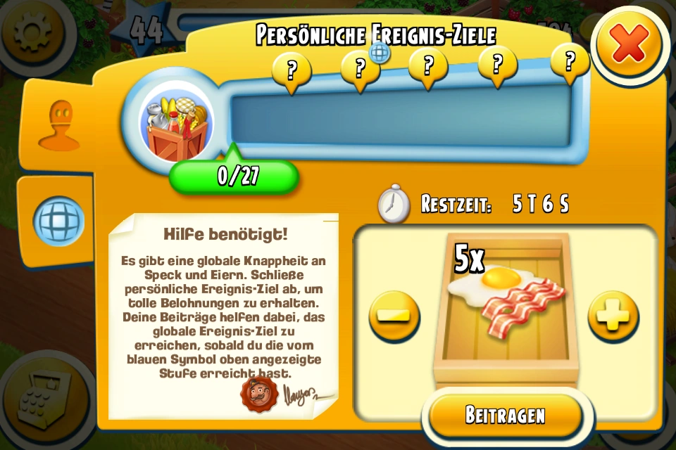 Bestimmte Produkte zu produzieren, wie hier z.B. Speck und Eier, sind sehr selten. Auf der Skala der persönlichen Ereignis-Ziele weißt der Globus darauf hin, ab wann dir die Belohnung für das globale Ziel zusteht, wenn dieses von allen Farmern weltweit gemeinsam erreicht wird. Ab dem Zeitpunkt kannst du auch einsehen, wie es um das Erreichen des Ziels steht.