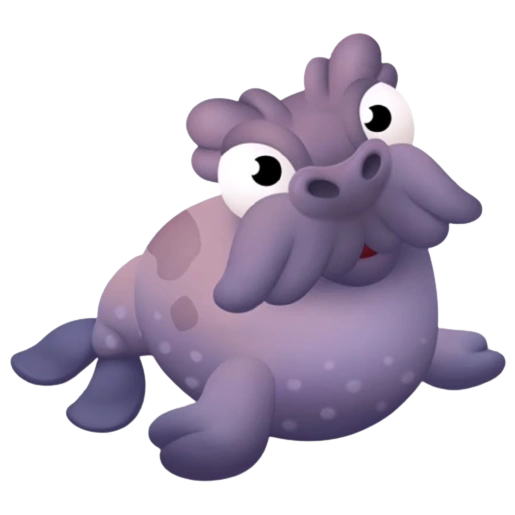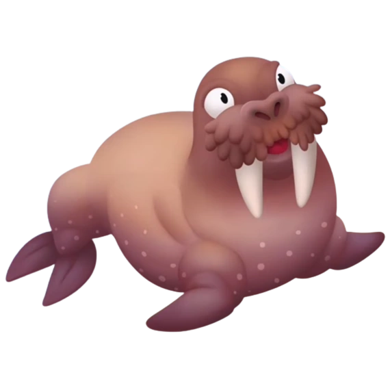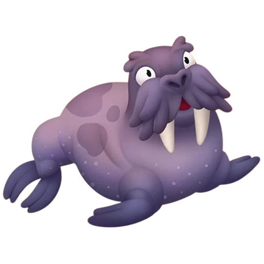 Серый морж переваливается на спинку, затем чешет левый клык, коричневый морж подбрасывает головой красный шарик, потом чешет правый клык. Детёныш серого моржа чешет усико и из него выпадает яблоко, которое он съедает, детёныш коричневого моржа подбрасывает хвостом крысный шарик об голову. возле каждого моржа летают голубые бабочки, а иногда прилетают птички.