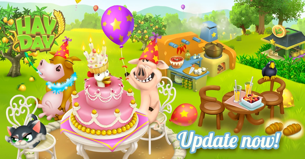 New Content: - New temporary Production Building: the Balloon Maker! Celebrate Hay Day's 12th Birthday with a new temporary Production Building given to all players. This building produces a set of celebratory Rock 'n' Roll style balloons!